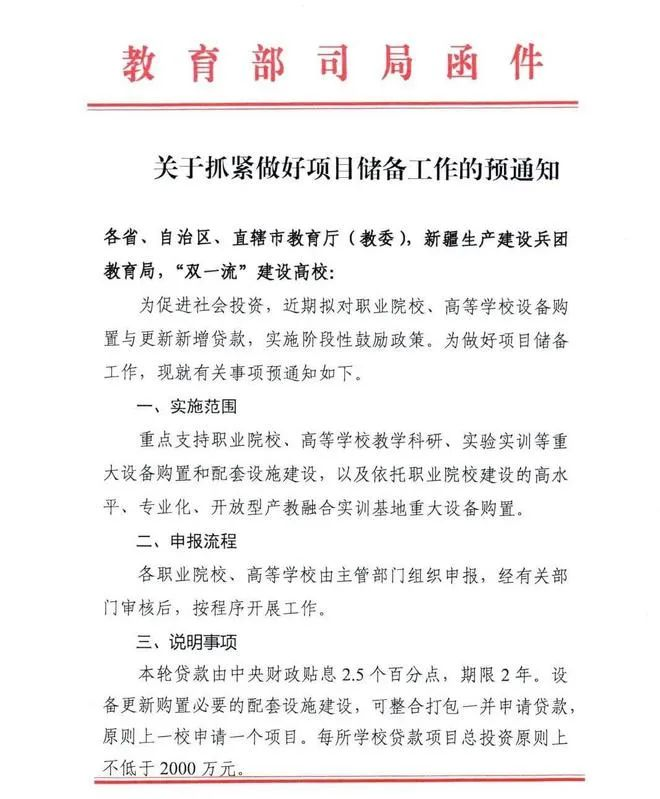教育部司局近日发布函件《关于抓紧做好项目储备工作的预通知》,为促进社会投资,近期拟对职业院校、高等学校设备购置与更新新增贷款,实施阶段性鼓励政策。
