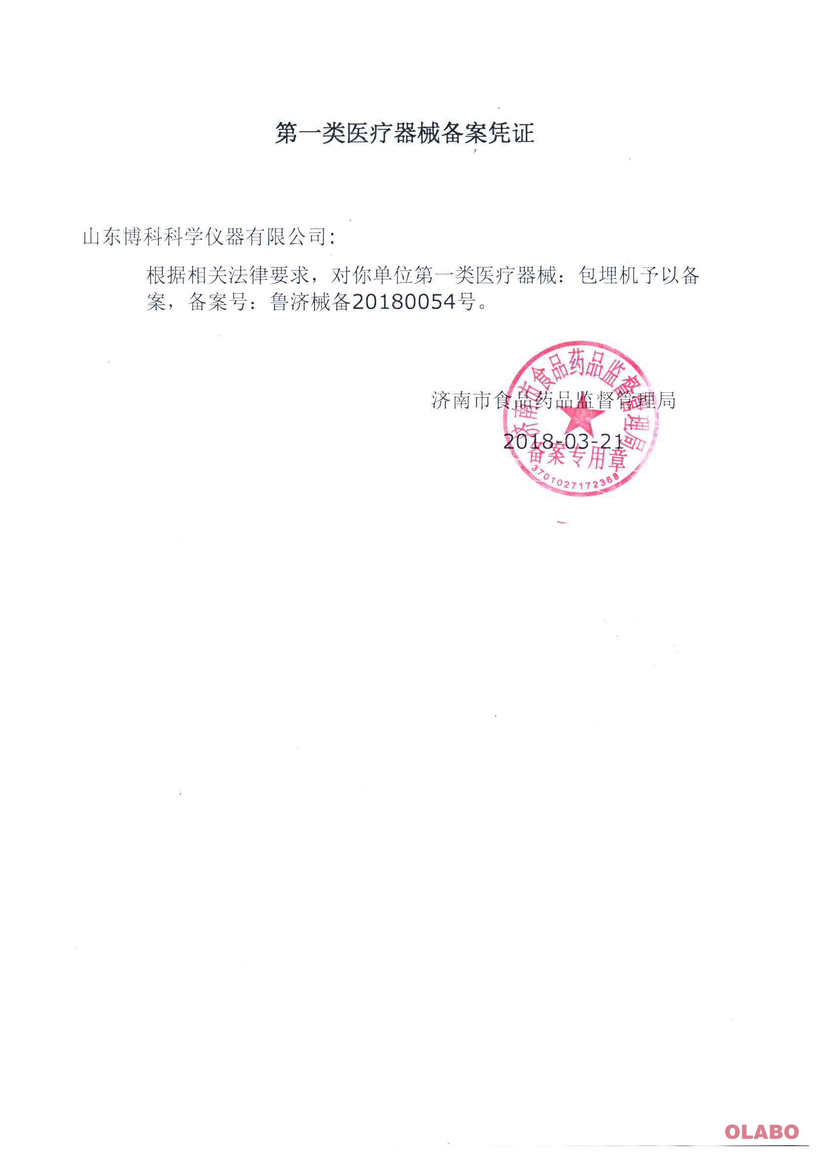 当前位置:首页>新闻中心 > 新闻资询> 热烈庆祝山东博科科学仪器有限公司取得包埋机和染色机产品的备案凭证和备案信息表