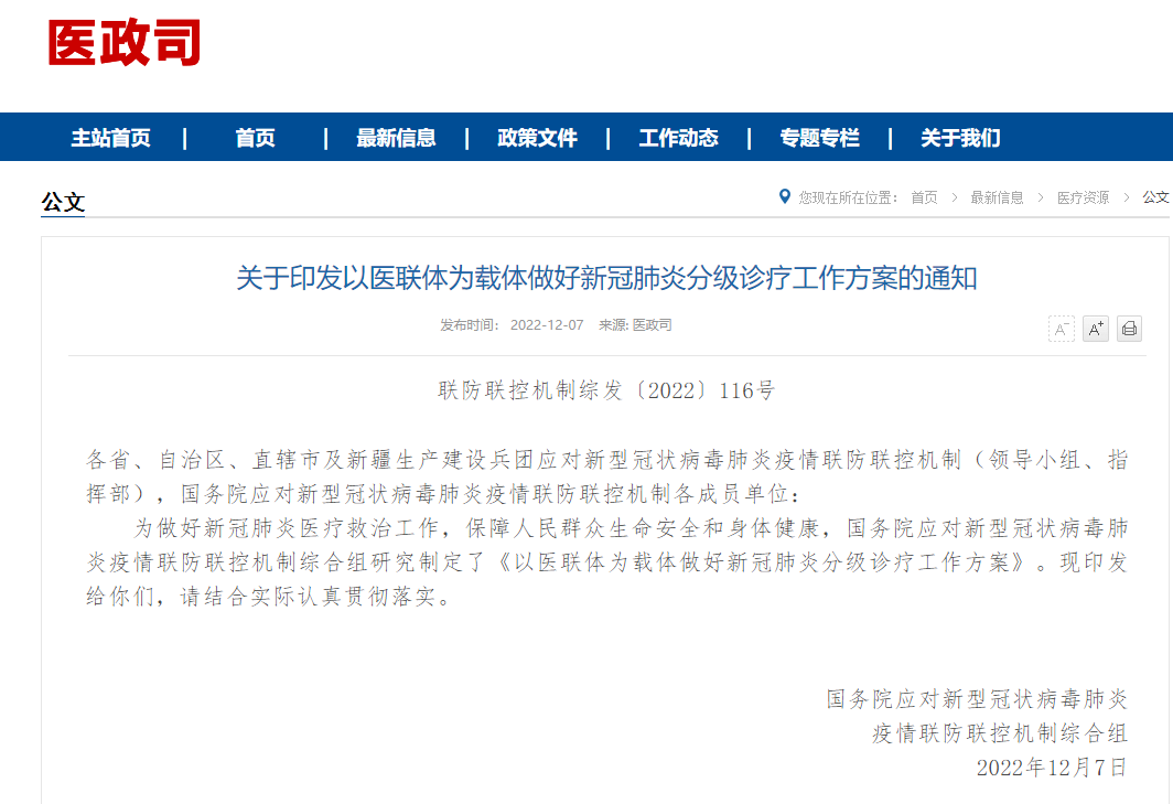在经历抗原检测试剂盒需求猛增,一盒难求后,12月7日,国家卫健委发布《关于印发医联体为载体做好新冠肺炎分级诊疗工作方案的通知》。